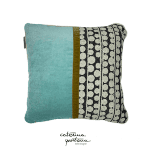 Linen cushion with Bouclé design in ecru and black combined with aqua and gold velvet