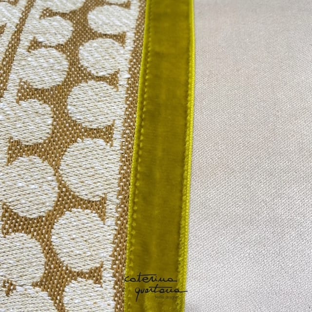 Cuscino in lino disegno Bouclé color biscotto, velluto color écru e nastro in velluto colore verde lime